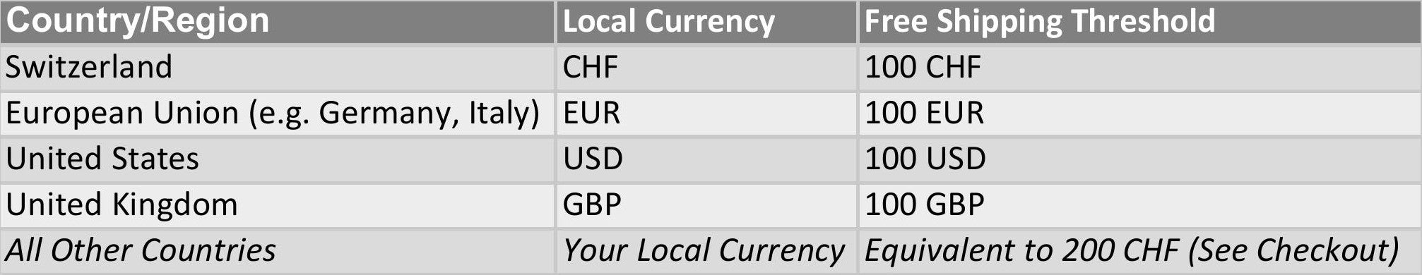 Below is a quick reference for the minimum order value required for FREE SHIPPING: